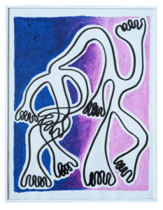 De vormen verbeelden de spanning tussen adem en verstikking, tussen wat wil ontsnappen en wat zich vastzet. De rode en roze tinten verwijzen naar kwetsbaarheid en tonen een fragiel evenwicht tussen lichaam en ruimte.